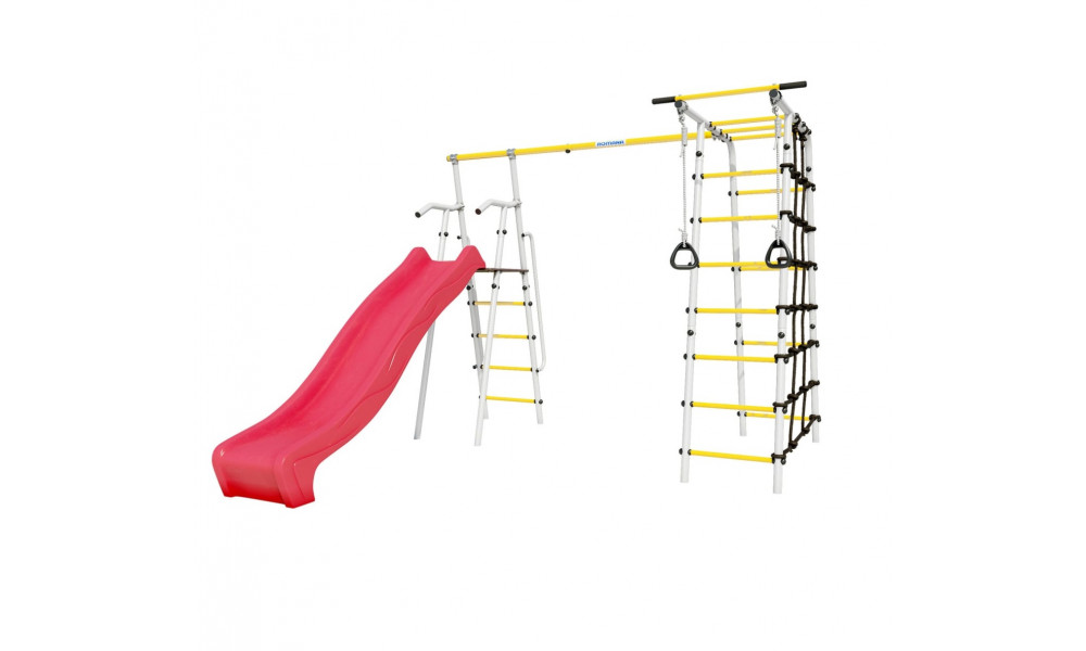 Дачный комплекс "Богатырь MAX" – это детский спортивно-игровой комплекс, который идеально подойдет для установки на дачном участке, в загородном доме и на частной детской площадке. Дает ребенку начальную физическую подготовку, помогает развить ловкость и гибкость. В комплекте: лестница металлическая двойная П-образная с рукоходом, сетка для лазания, турник неподвижный, горка пластиковая, кольца гимнастические.